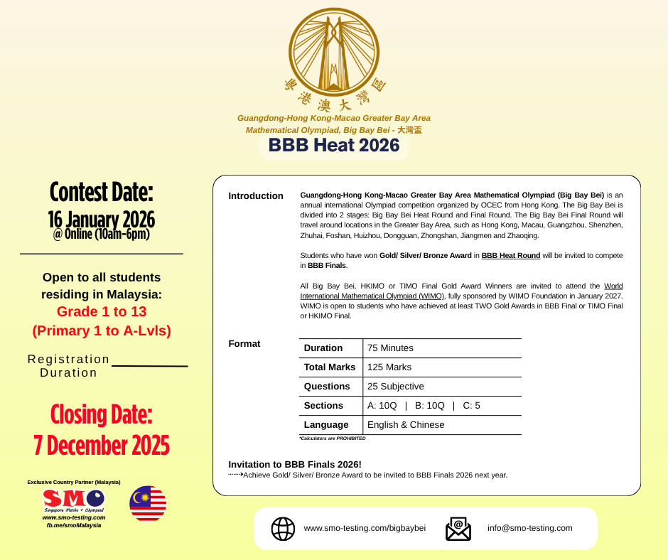 Students who have won 1st/ 2nd/ 3rd Prize Award in Big Bay Bei Heat Round will be invited to join Big Bay Bei Final.