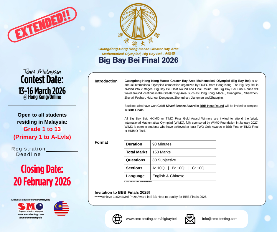 Guangdong-Hong Kong-Macao Greater Bay Area Mathematical Olympiad (Big Bay Bei) is an annual international Olympiad competition organized by OCEC from Hong Kong. The Big Bay Bei is divided into 2 stages: Big Bay Bei Heat Round and Final Round. The Big Bay Bei Final Round will travel around locations in the Greater Bay Area, such as Hong Kong, Macau, Guangzhou, Shenzhen, Zhuhai, Foshan, Huizhou, Dongguan, Zhongshan, Jiangmen and Zhaoqing.