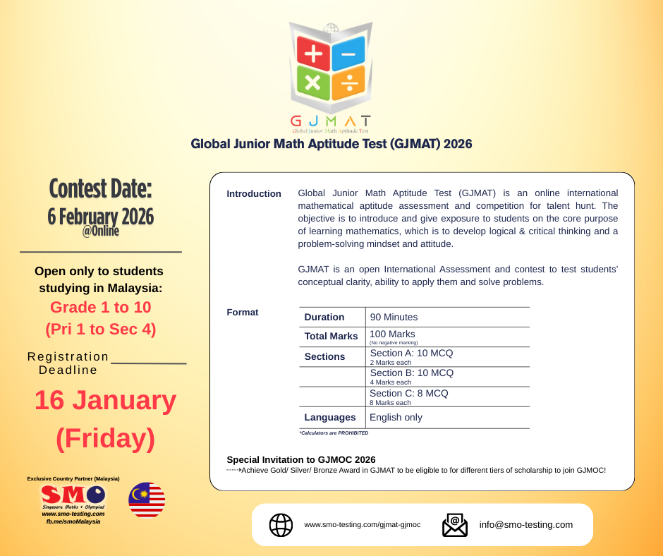 Global Junior Math Aptitude Test (GJMAT) is an online international mathematical aptitude assessment and competition for talent hunt and Global Junior Math Online Competition (GJMOC) is an International global online Olympiad competition for elementary and middle school students from Grade 1 to Grade 8. They are organized by Global Olympiad Academy, India.