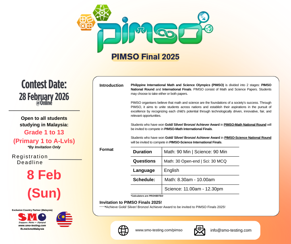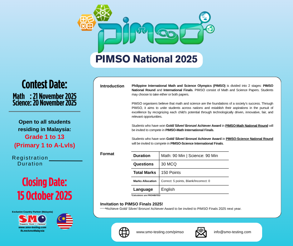 PIMSO-Science National Round and PIMSO-Science Final are open to all Year 1 to 13 (Primary 1 to A-Levels/STPM) Malaysian students. Students who have won Gold/ Silver/ Bronze/ Achiever Award in PIMSO-Science National Round will be invited to compete in PIMSO-Science International Finals.