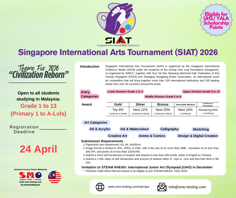 Singapore International Arts Tournament (SIAT) is open to all students residing in Malaysia: Grade 1 to 13 (Pri 1 to A-Levels/STPM). There is no pre-requisite to enter this Competition. All students are welcomed to join.