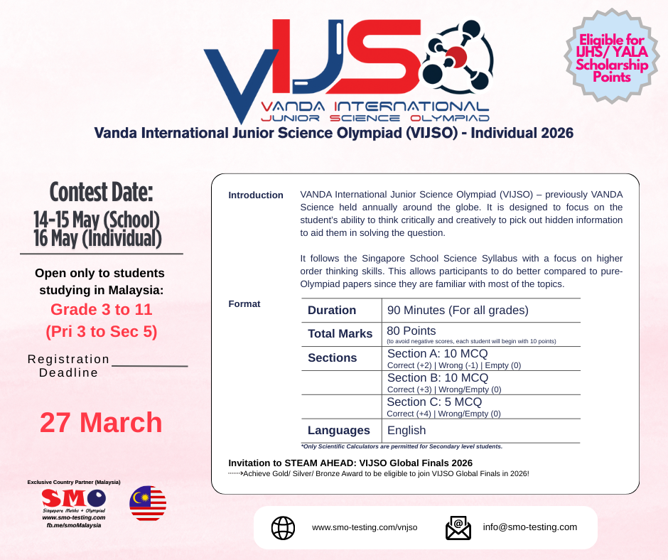 Students who have won Gold/ Silver/ Bronze Award in VIJSO will be invited to join STEAM AHEAD 2026: VANDA International Junior Science Olympiad (VIJSO) Global Finals. Contest entry is available on a first come first served basis, so register as soon as possible to avoid disappointment.