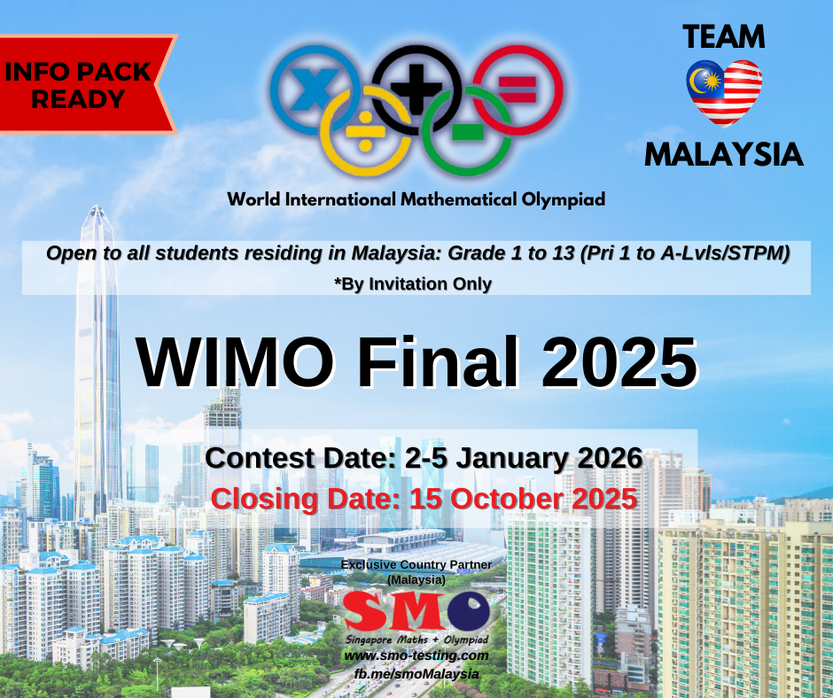 WIMO is open to all Malaysian students who have achieved a TWO Gold Awards (starting next calendar year 2023/24) in the Guangdong-Hong Kong-Macao Greater Bay Area Mathematical Olympiad (Big Bay Bei), Thailand International Mathematical Olympiad Final (TIMO Final) or Hong Kong International Mathematical Olympiad Final (HKIMO Final).